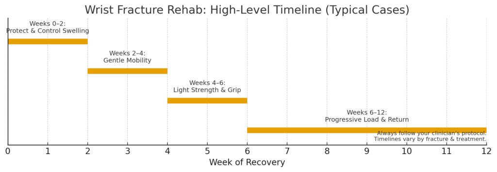When your wrist’s in a cast or brace, the big questions are: “what can I do now?” and “when can I get back to normal?” Here’s a realistic, no-drama roadmap. (Always follow your clinician’s protocol—fractures and surgeries differ!)